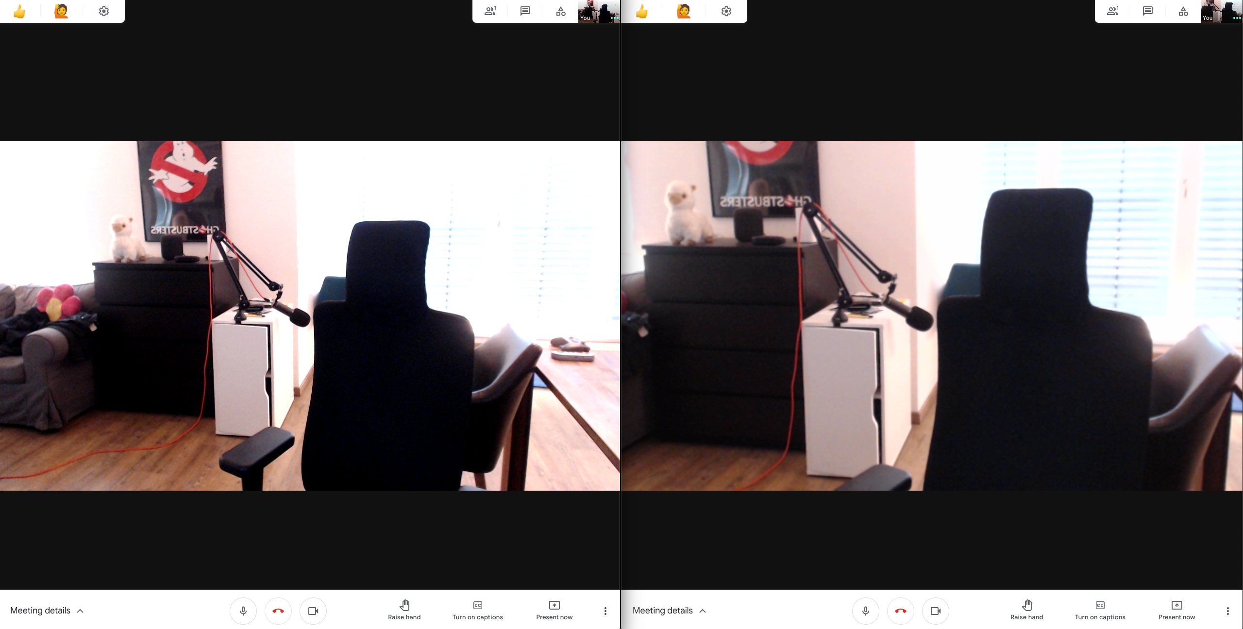 In the first week of the year, I noticed something peculiar during meetings, though. I looked like shit, and not just because I slept too little. Now take another look back at the image on top. The left version is how my camera feed used to look during meetings. And the right version is how it looked now. It’s zoomed in. And believe me, when I actually sit in that chair it looks much worse. You can open the image and zoom in, you’ll see it’s also quite washed-out on the right. It took me a while before I connected this to the problem from above. First I thought maybe 11.1 updated my webcam drivers and now uses some shitty face detection zoom-in, or Google Hangouts Meets got that feature.