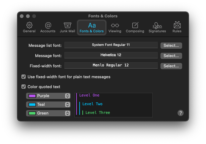 To be fair, the help article about that part of the dialog is excellent and states all that very clearly. Where it really loses me is the checkbox for “Use fixed-width font for plain text messages”.