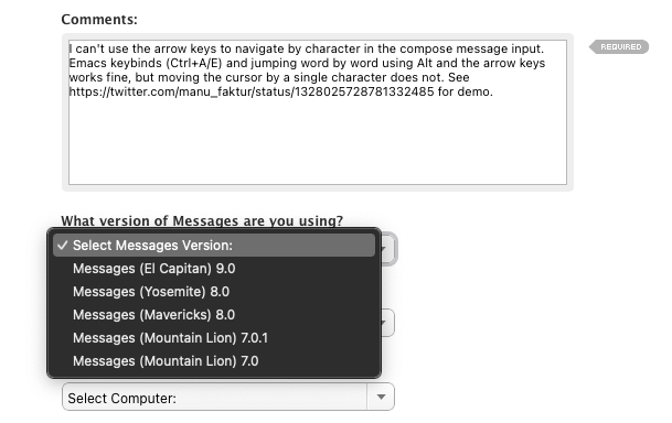 Trying to report a bug in Messages version 14, the latest and greatest one from Big Sir.