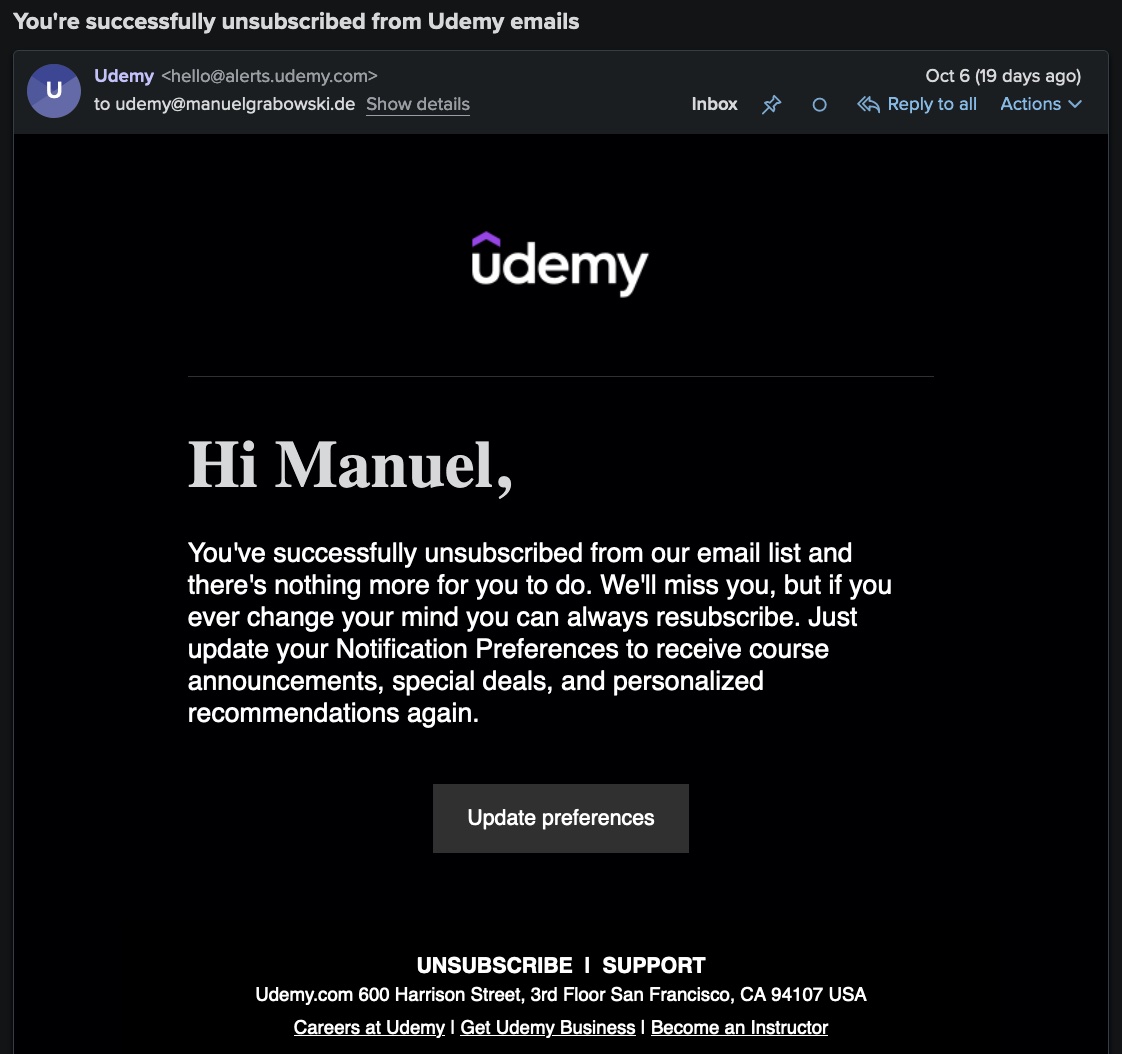 A few weeks ago I signed up for a Udemy course and opened an account there for that reason. This was literally the first email I got from them, more than five minutes before normal onboarding/invoicing/etc. mails. I don’t even remember consciously having deselected any “Newsletter” checkboxes during the process – but even if I did that still means I have never signed up for anything in the first place.
