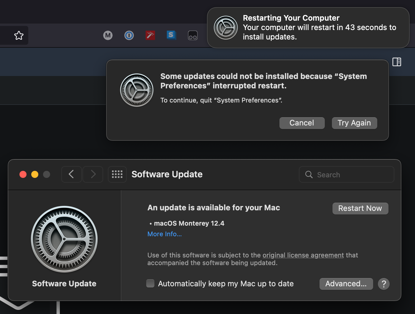 Five seconds after the “Restarting Your Computer” popup the error message in the middle followed – as the countdown kept going, I just waited it out. When the countdown was done, nothing happened. I then clicked “Try Again” in the error message, and again nothing happened.