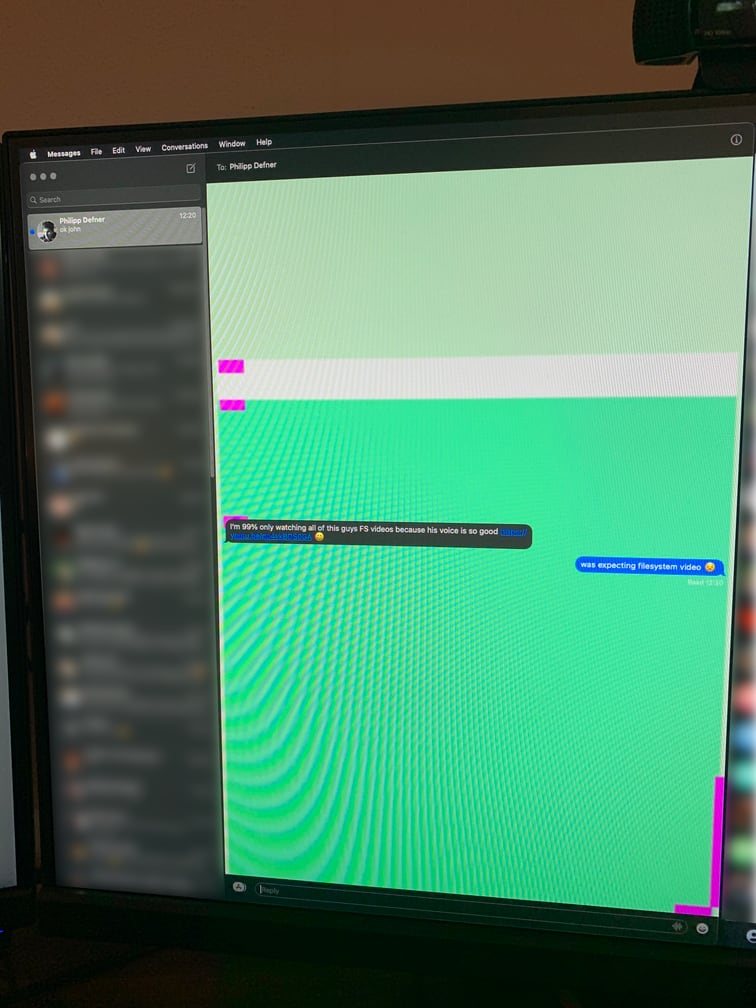 Why am I filming and photographing my screen? Well as it turns out, this does not show up in screenshots or screen recordings at all. They look perfectly fine, so it must be a bug fairly “late” in the graphics pipeline, I suppose? Pinky promise, video and photo have not been modified in any way except for the blurring of personal details.