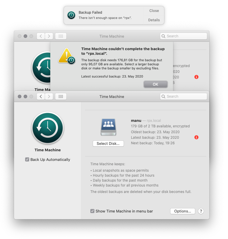 I don’t even know what to say anymore. Even ignoring how it says 179 GB available in the prefpane and 95,07 GB in the error message, why is it an error at either of those values? It says that the oldest backups are deleted when my disk becomes full. Why does this error message exist?